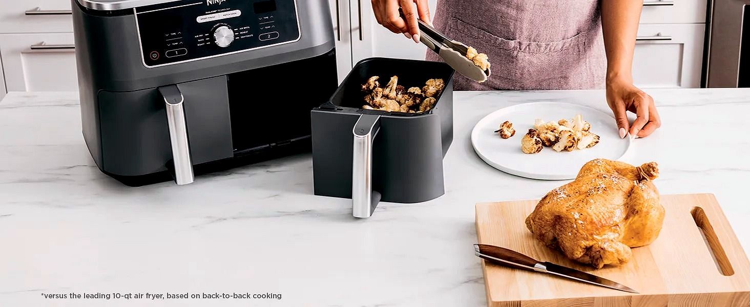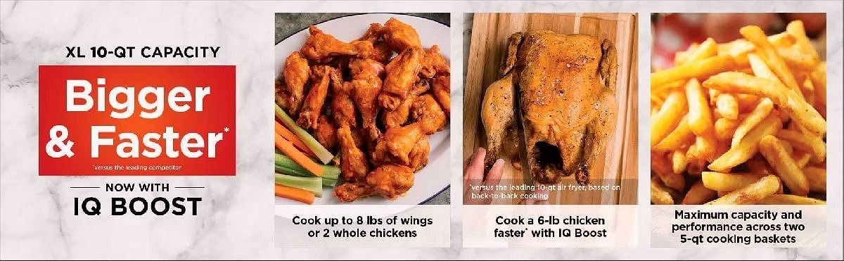 Capacité totale de 10 qt avec deux paniers indépendants : préparez simultanément le plat principal et l’accompagnement.